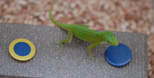 Когда же ученые ввели в игру второй диск другой расцветки и переложили пищу под него, ящерицы поняли, где теперь находится угощение, и запоминали правильный диск (следует, впрочем, заметить, что подобную гибкость продемонстрировали два анолиса из шести).