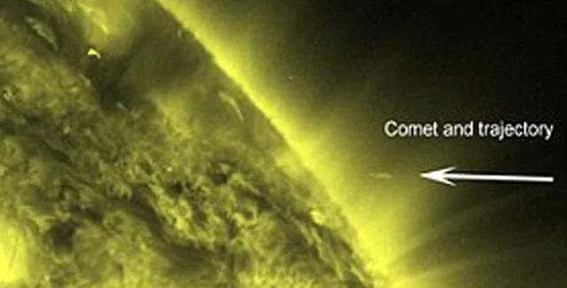 Таким образом можно увидеть, как комета-самоубийца на огромной скорости врезается в солнечную корону и спустя мгновение испаряется в раскаленной поверхности звезды. По данным ученых, процесс полного испарения кометы занимает примерно 15 минут.