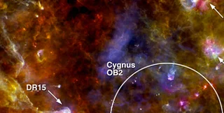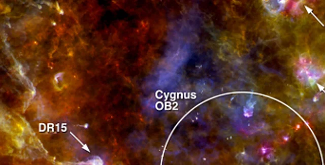 В левой части изображения видна туманность, напоминающая шею лебедя. Правее и ниже можно разглядеть другую туманность, являющуюся, по словам астрономов, выбросом газа сверхгигантом G79.29+0.46, расположенным в ее середине. Самого сверхгиганта на изображении не видно.