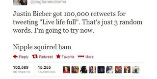 Такое высказывание канадского певца оказалось популярным и его перепостили более ста тысяч раз за сутки. Макдермотту пост Бибера показался бессмысленным и он решил повторить успех исполнителя, опубликовав твит из трех случайных слов: "Сосок белка ветчина".