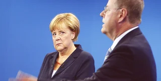 Меркель пришла на дебаты в черном брючном костюме с единственным аксессуаром - ожерельем цветов немецкого флага: черного, красного и золотого.