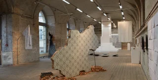 Первое, что видят гости выставки в украинском павильоне Vienna Art Week, — инсталляция Жанны Кадыровой "Без названия". Это выложенная из обугленного кирпича карта Украины с буквально отколовшимся Крымом. Обломки полуострова разбросаны вокруг в художественном беспорядке. Обратная сторона стены заклеена ностальгическими обоями в цветочек, напоминая не то о разрушенном доме, не то о крепкой связи фронта и тыла.