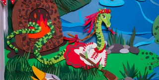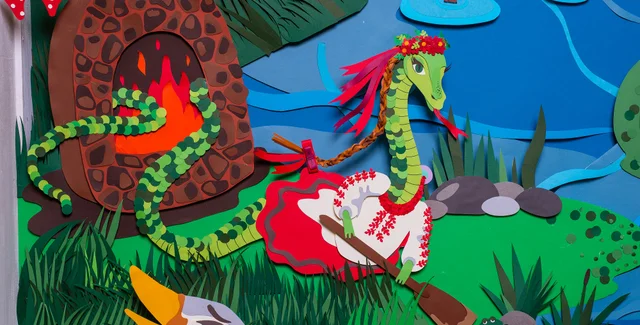 Главная часть экспозиции — двухметровые украинские сказки из бумаги, которые сделала студия Леси Патоки. Каждая сказка состоит из более 5 тысяч деталей.