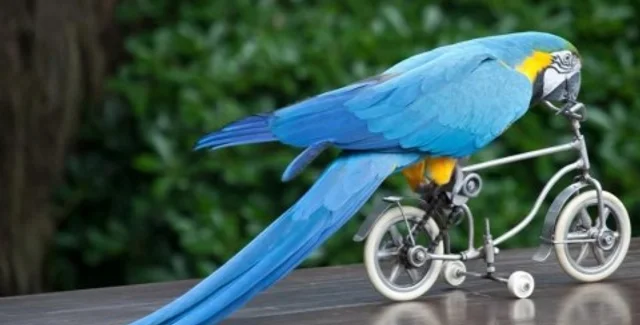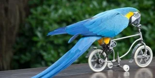 Китайские попугаи понемногу обучаются езде на велосипеде.