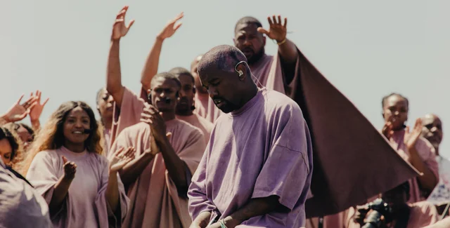 Тогда Канье устроил богослужение 21 апреля. Явился он на него с женой, Ким Кардашьян и с детьми, а также с целой группой людей в одинаковых сиреневых балахонах, и устроил перформанс в хиппи-стилистике.