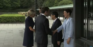 Но прежде, чем отбыть в Осаку, французский президент встретился с императором Японии Нарухито и его супругой императрицей Масако. Встреча прошла в Императорском дворце в Токио.