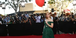 Для красной дорожки Джессика выбрала изумрудно-зеленое платье от Zuhair Murad и дополнила образ красным воздушным шариком. Именно с таким появляется в фильме клоун Пеннивайз.