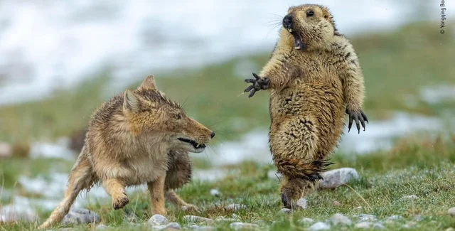 Фото Бао отобрали из более чем 48 000 заявок. По мнению судей, этот снимок отображает главную задачу природы - борьбу за выживание. Фото сочетает в себе юмор и ужас, и изображает неожиданную встречу между тибетской лисой и сурком.