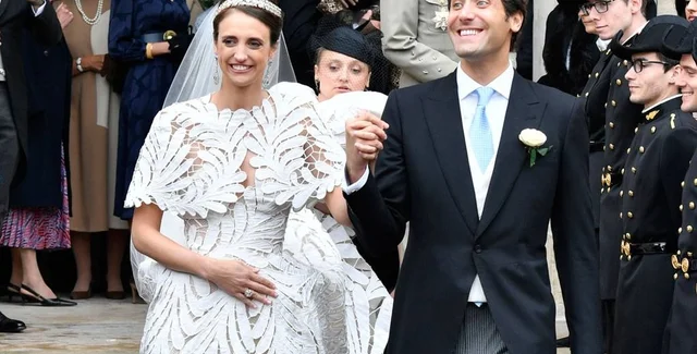 Невеста, правнучка последнего австрийского императора Карла I, который "отстранился от управления государством" в 1918 году, выбрала для значимого события пышное платье от Oscar de la Renta и длинную вуаль. Ее волосы украшала фамильная тиара, а руку – подарок жениха - кольцо стоимостью в один миллион фунтов стерлингов с бриллиантом, ранее принадлежавшим последней императрице Франции.