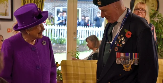 Королева встретилась с жителями поселка, причем со старейшим его обитателем – 100-летним Джоном Риггсом, ветераном Второй мировой. Солдат воевал в Центральной Бирме и охранял, кроме всего прочего, железнодорожные пути.