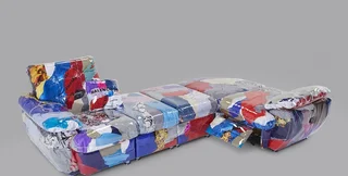 Это угловой диван с мягкими контурами. А чехол выполнен из прозрачного винила, который также получен в результате переработки – в ход пошли ранние работы Нуриева. Под прозрачной оболочкой отлично видна набивка – те самые дизайнерские вещи. В комплекте также идет декоративная подушка с логотипом Balenciaga.