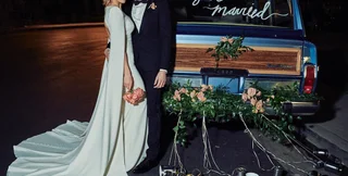 На фото жених и невеста позируют в свадебных нарядах на фоне украшенного автомобиля с надписью Just Married. Для торжества 32-летняя актриса выбрала наряд от Jenny Packham, а музыкант — смокинг от Celine. Дизайнер также пошила маленькое платьице для дочери актрисы.