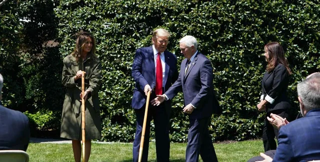 Супруги посадили клен на южной лужайке у Белого дома. Вместе с ними в церемонии посадки дерева также приняли участие вице-президент США Майк Пенс и его жена Карен.
