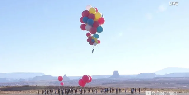 Иллюзионист Дэвид Блейн пролетел над пустыней на связке из 52 воздушных шаров