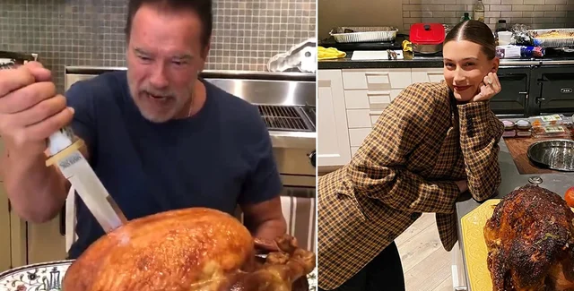 "Железный Арни" и Хейли Бибер с праздничными индейками | Фото: соцсети