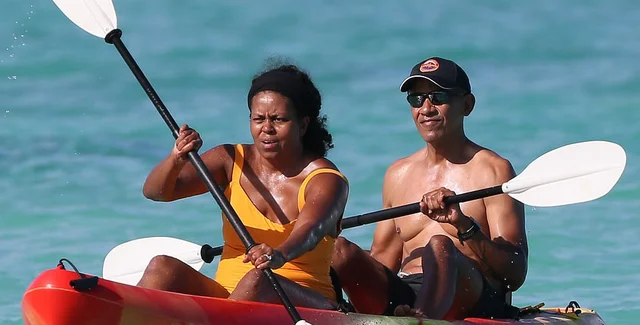 Папарацци сфотографировали 44-го президента США вместе с его женой, Мишель Обама, во время морской прогулки на каяке.
