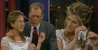 А ближе к концу семиминутного интервью ведущий спрашивает Энистон "может ли он попробовать что-нибудь", хватает ее за голову, словно желая поцеловать, а когда Энистон спрашивает, что он собирается делать, Леттерман засовывает себе в рот прядь ее волос и начинает ее посасывать.