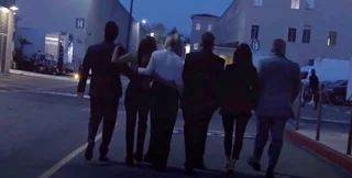 На кадрах видно, как шестеро друзей идут по темной улице вперед, спиной к зрителям.