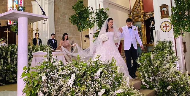 По словам инсайдеров, проход к алтарю был украшен белыми цветами. В рамках церемонии выступили местные певцы, а венчание закончилось зажигательным танцем, к которому присоединились молодожены.