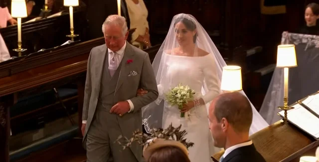 Сдержанное и элегантное платье Меган Маркл от Givenchy был разработано Клэр Уайт Келлер. Его дополняла пятиметровая фата и фамильная диадема-бандо британской королевской семьи, которая принадлежала Марии Текской, бабушке Елизаветы II.