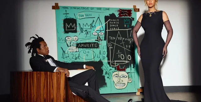 Снимками певица поделилась и на своей странице в Instagram. Она позирует в черном длинном платье с открытой спиной, облегающеми ее фигуру, и черных капроновых перчатках выше локтя, а супруг Бейонсе – в элегантном черном смокинге смотрит на нее, сидя в кресле. Фоном для фото выбрана картина Equals Pi из частной коллекции Жана-Мишеля Баския, напоминающая фирменный цвет Tiffany Blue.