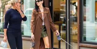 Певица была одета в длинном коричневом пальто от Luar и самой желанной сумочкой сезона – Луар Ана в тон пальто. Образ Дуа Липа дополнила сапогами от Jimmy Choo и клетчатой юбкой от Attico.