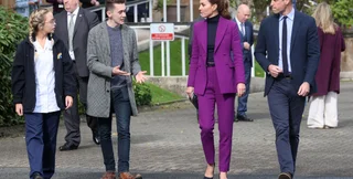 Герцогиня Кембриджская выбрала для встречи со студентами ансамбль в сине-фиолетовых тонах, которые очень популярны в осеннем гардеробе.