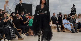 Наоми Кэмпбелл появилась на подиуме в черном платье с укороченным жакетом, вышитом стразами. Вышивка повторялась и на полупрозрачных колготках.