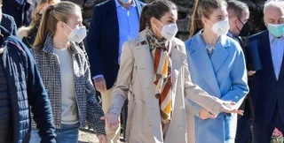 Недавно королевская семья посетила Санта-Мария-дель-Пуэрто-де-Сомьедо, которая была удостоена звания лучшей астурийской деревни 2021 года. Для поездки королева Летиция выбрала бежевый тренч от Hugo Boss, коричневые джинсы Massimo Dutti, темно-коричневые ботинки, а аутфит дополнила пестрым пышным объемным шарфом. Волосы она собрала в хвост, а на пальце у нее заметили оригинальное золотое кольцо от KHallamJewels. Таким образом королева продемонстрировала образ, который можно назвать "осенний шик", сочетав в наряде все самые последние модные тренды: шарф, тренч, джинсы, при этом все вещи гармонировали между собой, создавая цельный ансамбль.