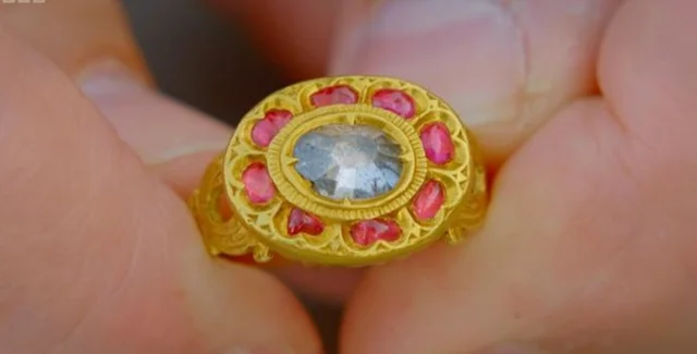 "Затем я перевернул кольцо, и оно показало эту группу. В середине у вас большой тусклый серый камень. Тусклый серый камень окружает серия маленьких красных драгоценных камней", – продолжил эксперт.
