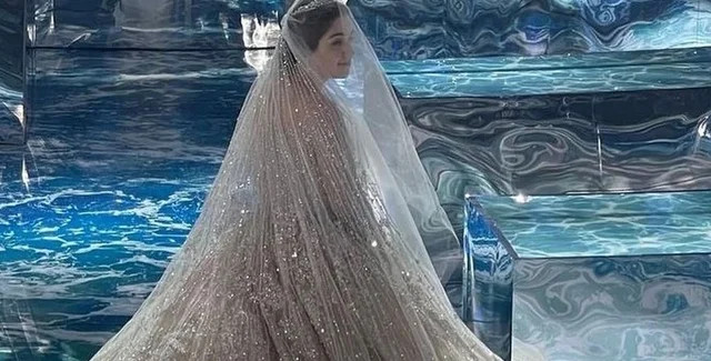 Платье Софии Гуцериевой было от известного бренда Elie Saab: фата и шлейф были усыпаны стразами и драгоценными камнями, по слухам, оно стоило несколько миллионов рублей.
