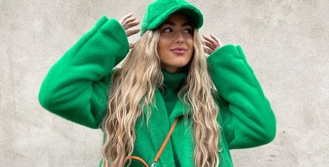 Речь идет о трикотажных широких брюках с большими накладными карманами по бокам. Это удобная и теплая вещь, идеально подходящая не только под первые дни весны, которые, как правило, все же еще холодные и часто сырые, но и для теплой зимы. Эмили умело сочетала брюки с зеленым пальто из эко-меха и такой же кепкой, добавив в качестве акцента яркую сумочку. Образ девушка дополнила белыми кроссовками.