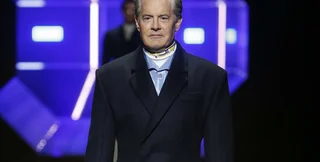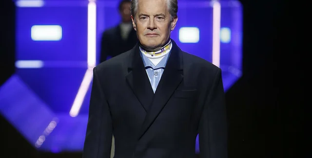 Звезда "Твин Пикс" Маклахлан открывал показ, уверенно продефилировав перед более чем двумя сотнями гостей. Он был одет в голубые атласные брюки, рубашку и перчатки, а также в длинное черное пальто.