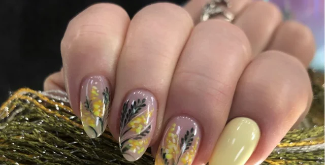 Вокруг одна сирень? Можно разбавить наплыв лавандово-сиреневого дизайна красными или зелеными оттенками, а цветы сделать абстрактыми, выбрать весенние листочки и веточки. А еще не забываем про самые весенние цветы мимозы — они отлично смотрятся на ноготках.