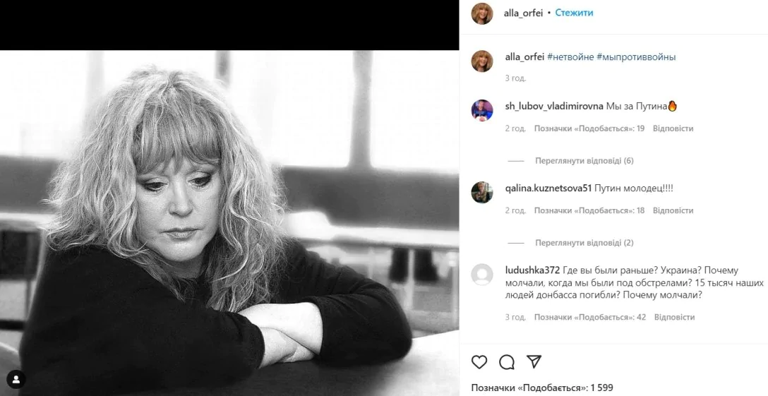 Сама Пугачева поделилась своим черно-белым фото, оставив в подписи тэги #нетвойне #мыпротиввойны.