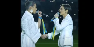 Певицы вышли на стадион в белой одежде, держась за руки, и у каждой из них на запястье была лента в цветах украинского флага. Они пели прямо на газоне, а футболисты стояли на заднем плане.