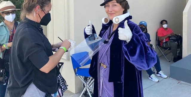 На снимках она позирует в нарядах 30-ых годов прошлого века возле трейлера, а также в компании других участников съемок.