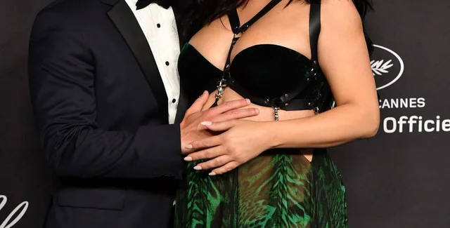 Знаменитость посетила ужин Chopard Loves Cinema в рамках 75-го Каннского кинофестиваля. Беременная модель вышла на красную дорожку Лазурного побережья в довольно откровенном образе – темно-изумрудном бархатном бра и полупрозрачной длинной юбке с кожаными ремнями.