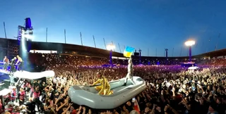 На концерт собралось около 50 тысяч зрителей и кто-то в толпе поднял украинский флаг. Музыканты, которые добирались на сцену на надувных лодках, взяли его и подняли на головой.