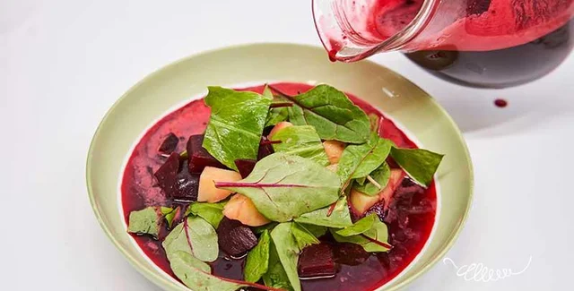• Добавляем картофель, кубики запеченной свеклы, зелень и заливаем смесью свекольного фреша и кваса.