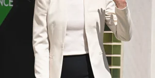 Для визита герцогиня Кембриджская выбрала стильный костюм, состоящий из белого жакета и черных брюк. Образ Кейт дополнила белым плетеным клатчем. Супруга принца Уильяма выглядела отдохнувшей и счастливой.