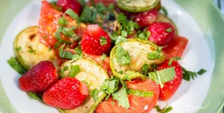 "Можете мне поверить, салат с клубникой, томатами и базиликом — идеальный сезонный рецепт", — отмечает Евгений Клопотенко и советует попробовать сочетание классического томаты-базилик со сладкой клубникой.
