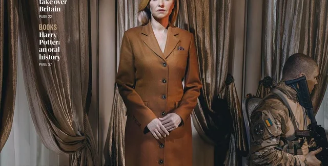 Рядом с Зеленской на снимке можно увидеть сидящего на стуле военного с оружием — вероятно, телохранителя супруги президента. Автором фото стал французский художник Антуан Д'Агата.