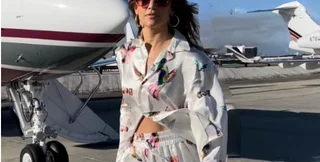 Так, она надела атласный комплект из двух частей с принтом колибри от Nahmias, а образ дополнила белыми туфлями на платформе с Т-образным ремешком и высоким каблуком, ярко-розовыми огромными акриловыми солнцезащитными очками и стильной ярко-розовой сумочкой Napa за $2800 (82, 7 тыс) с золотыми деталями от Valentino.