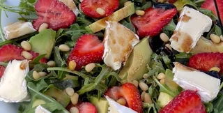 • На тарелку выкладываем рукколу. Добавляем клубнику, авокадо, кусочки бри. Посыпаем кедровыми орешками по желанию и поливаем заправкой.