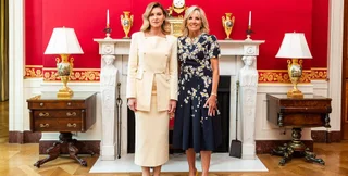Вместе с ней в Белый дом приехала посол Украины в США Оксана Маркарова. Для встречи она выбрала удлиненный жакет синего цвета и юбку миди в тон. Наряд посла дополняли сине-желтые ожерелье на шее и браслеты на руках.