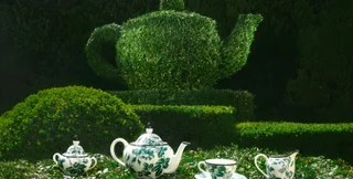 Элегантным фоном для презентации предметов интерьера, посуды и мебели послужил пышный сад с мебелью из зелени.