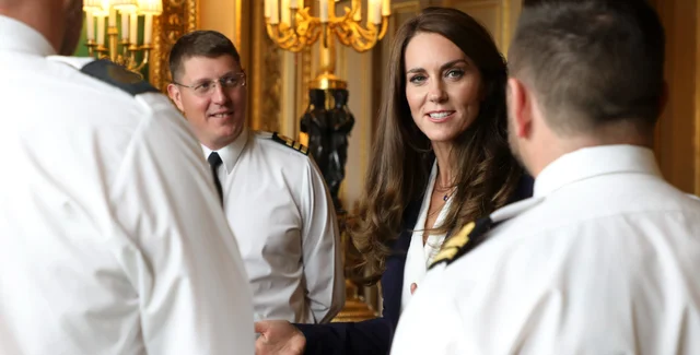 40-летняя принцесса Уэльская Кейт встретилась со служащими Королевского флота HMS Glasgow и выбрала для визита элегантный брючный ансамбль темно-синего цвета от Alexander McQueen.