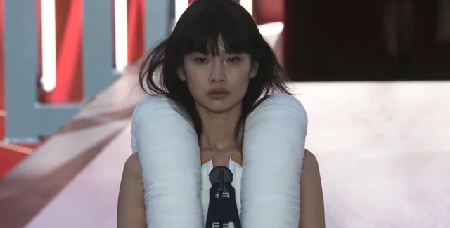 Модели выходили по белому подиуму и обходили зрителей по кругу. Открывала показ звезда южнокорейского сериала "Игра в кальмара" Чон Хо Ен.