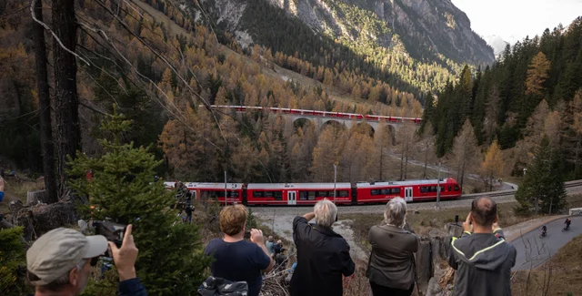 Около 3000 человек заплатили большие деньги за билеты, чтобы увидеть проезд поезда на огромном экране, установленном за пределами Бергуна, который находится на полпути по извилистому пути поезда Альбула/Бернина, являющегося объектом Всемирного наследия ЮНЕСКО с 2018 года.